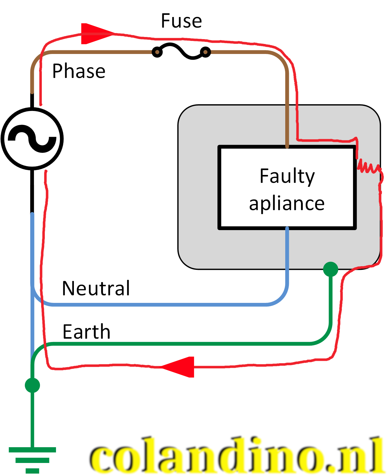 Als er een storing optreedt in elektrische apparatuur, kunnen de metalen onderdelen aan de buitenkant van die apparatuur onder spanning komen te staan. Dit kan komen doordat er een interne kortsluiting is tussen interne delen onder spanning en de metalen behuizing van de apparatuur. Denk bijvoorbeeld aan een defecte wasmachine. Een storing kan veroorzaakt zijn door een elektrische fout, mechanische schade of beschadigde elektrische draden die de metalen behuizing van de elektrische apparatuur raken. Op het moment dat u de defecte wasmachine aanraakt, stroomt er elektriciteit van fase naar de metalen behuizing, via u, naar aarde. Vanaf de aarde stroomt de elektriciteit dan naar de nul van het elektriciteitsnet. De stroomkring is compleet. Elektriciteit blijft lopen tot de zekering in het elektriciteitsnet gesprongen is. Maar zoals in de vorige situatie bent u wellicht al dood. |