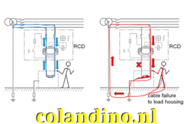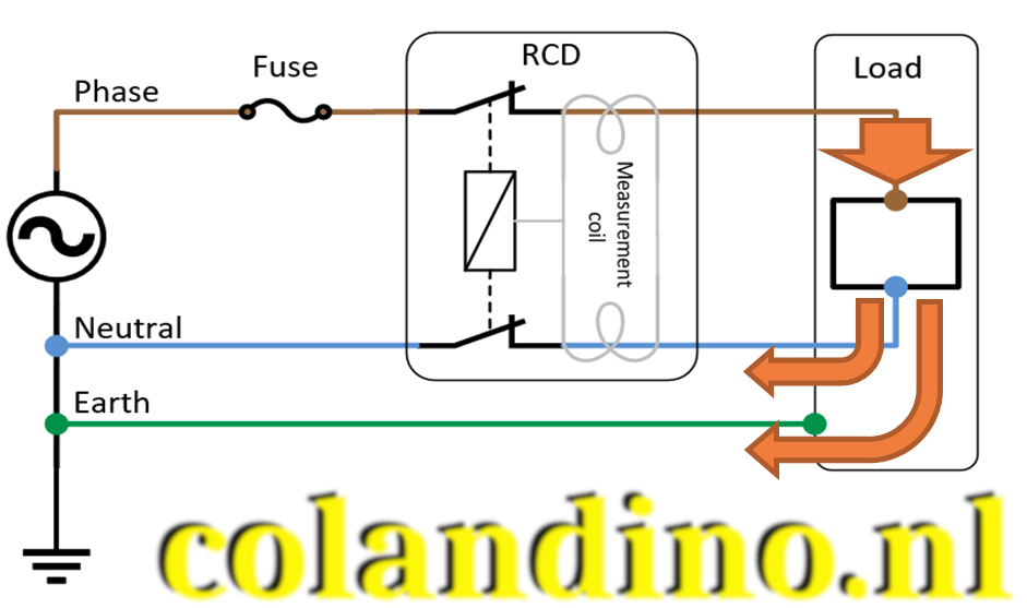 | Naast het tegelijkertijd aanraken van een nul en een fase draad, is er nog een andere manier waarop een onveilige situatie kan ontstaan en dat is als de stroom via de aarde stroomt. Dit komt vaker voor dan dat iemand tegelijkertijd een fase- en een nulgeleider aanraakt. De nul aansluiting is op een bepaald punt aangesloten op aarde. Dit kan in de huisinstallatie, in het distributienetwerk of bij de aggregaat (het sterpunt) zijn. |