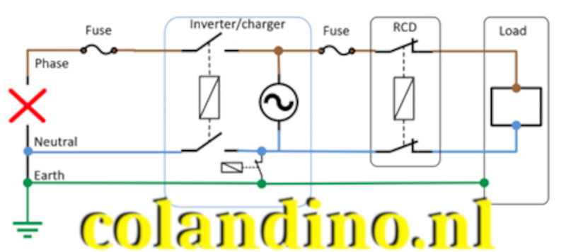De omvormer/acculader is in omvormermodus: Als de AC-voeding afgekoppeld is, uitgeschakeld werd, of een storing heeft, dan opent de AC-ingangsrelais. Als het AC-ingangsrelais open is, dan heeft de installatie geen nulgeleiderverbinding meer. Daarom wordt tegelijkertijd het aardrelais gesloten. Zodra het aardrelais sluit, heeft de omvormer/lader een interne nulgeleiderverbinding gemaakt. Deze link is nodig zodat de aardlekbeveiliging in AC-uitgang zal werken. |