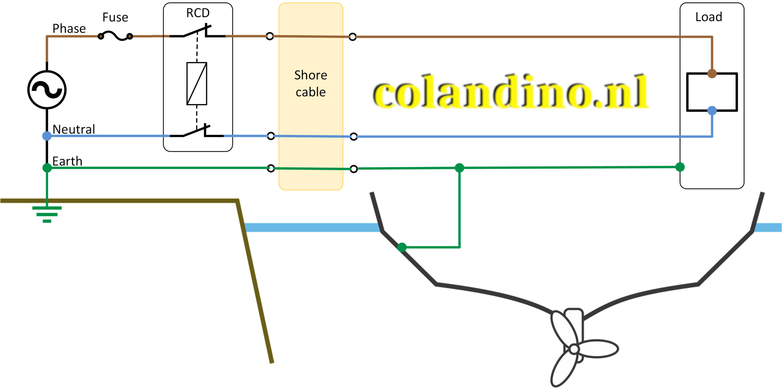 Een boot wordt aangesloten op walstroom Als een boot is afgemeerd en aangesloten op de walstroom, dan is de installatie vergelijkbaar met die van een woonhuis. Er is maar één verschil; de boot heeft geen eigen aardaansluiting, zoals de aardingspen die u in een huis vindt. De bootinstallatie vertrouwt op de aarde van de walaansluiting. Helaas is deze aarde niet altijd betrouwbaar omdat de kabels in de haven vaak lang zijn en mogelijk een onvoldoende dikke kernoppervlakte hebben. Om een veilige situatie te maken, moeten de metalen onderdelen van de boot, zoals de romp, worden verbonden met de inkomende aarde van de walstroomkabel. De aarding van de walstroom is verbonden met de nulleider. Als er een aardlek optreedt, loopt er stroom door de aardgeleider in de voedingskabel, maar ook via de romp door het water en terug naar de aarding van de wal. Beide aardlekschakelingen hebben hetzelfde potentiaal en zijn als het ware parallel geschakeld. Maar er gaat meer stroom door de aardgeleider in de walkabel. De weg door de romp en het water heeft een grotere weerstand. De aardlekbeveiliging vindt nog steeds een aardlek omdat het de fasestroom ten opzichte van de stroom via de nulleider zal vergelijken. |