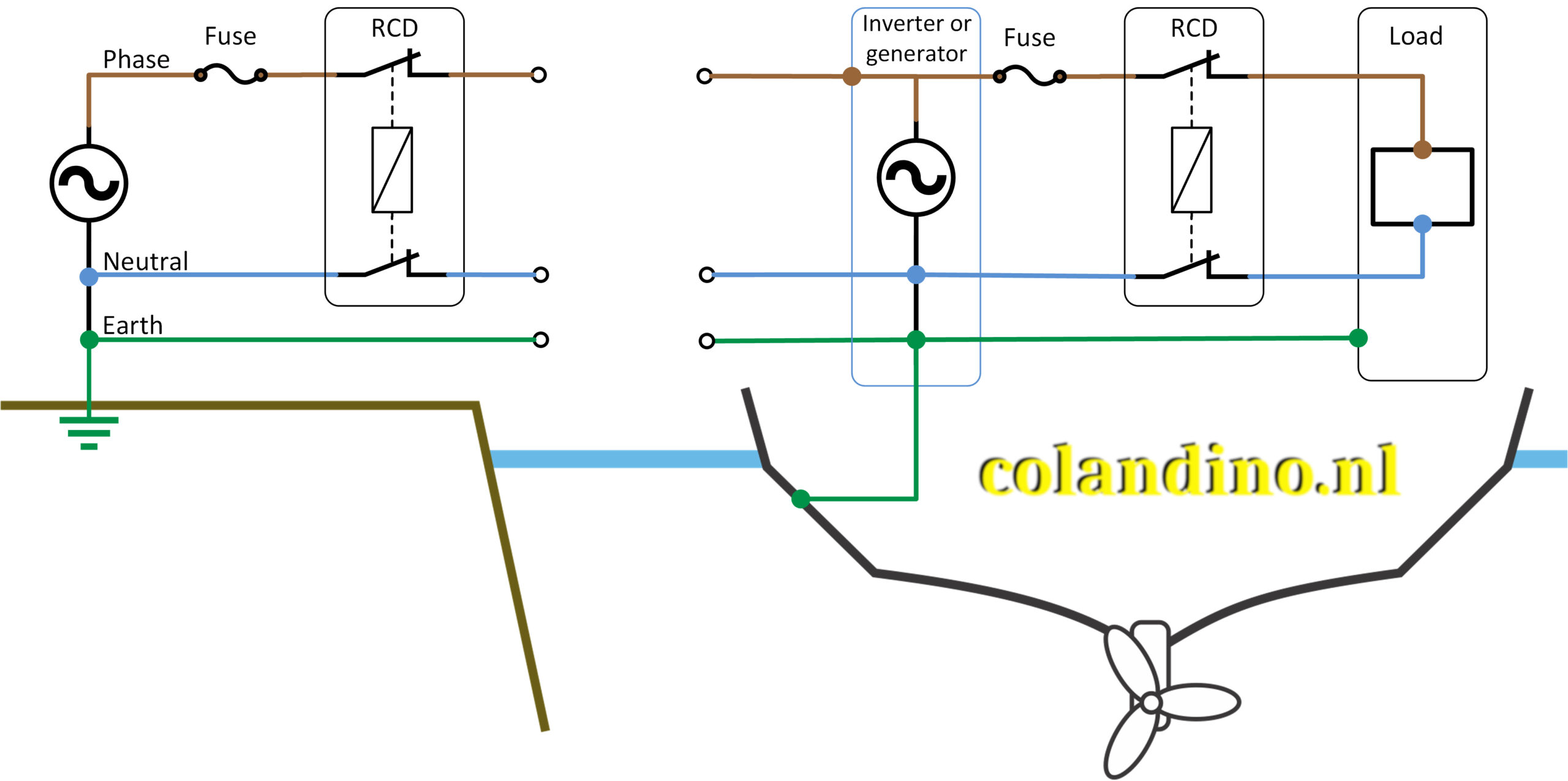 Een boot is losgekoppeld van de walstroom Zodra de boot wordt losgekoppeld van de walstroom, verandert de hele installatie omdat de installatie nu geen deel meer uitmaakt van het elektriciteitsnet en de verbinding met nul en aarde verloren gaat. De installatie is nu de hoofdvoeding en vormt samen met de belasting zijn eigen autonome stroomkring. Er loopt geen stroom in de romp en in het water. |
