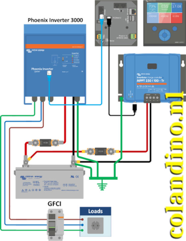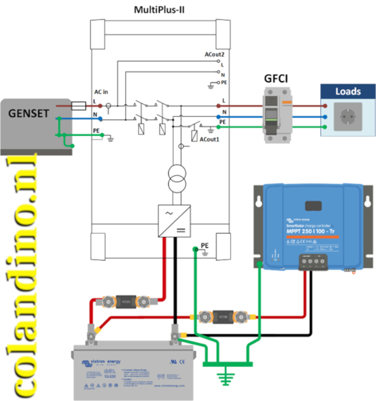 | Tot nu toe hebben we het gehad over AC-aarde of aarding in AC-installaties, maar aarding is ook nodig voor de DC-componenten in een installatie. Dit hoofdstuk beschrijft enkele veelvoorkomende installaties die niet alleen een omvormer/acculader bevatten, maar ook een accubank, een PV-lader en een PV-reeks. |