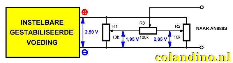 In de volgende tabellen zult u zien dat wij spanningen tot op 1 mV nauwkeurig aan de AN888S en de VC650BT hebben aangeboden. Hebben wij dure spanningsbronnen die dat kunnen? Nee, maar er is een eenvoudig middeltje om een spanning zo exact in te stellen, zie onderstaand schema. Stel dat u een gelijkspanning van exact 2,000 V wilt genereren. Stel dan uw labvoeding in op een uitgangsspanning van bijvoorbeeld 2,5 V. Sluit twee potentiometers R1 en R2 van 10 kΩ over de uitgangen van uw voeding. Sluit een potentiometer R3 van 100 kΩ aan tussen de lopers van de twee andere potentiometers. Zet de loper van R3 in de linker stand en regel R1 af op een uitgangsspanning van 1,95 V. Zet de loper van R3 in de rechter stand en regel R2 af op een uitgangsspanning van 2,05 V. Over de potentiometer R3 valt nu slechts 100 mV en het is geen probleem om, door verdraaien van de loper van R3, de uitgangsspanning op exact 2,000 V af te regelen. Deze methode eist wél dat uw labvoeding zeer stabiel is.