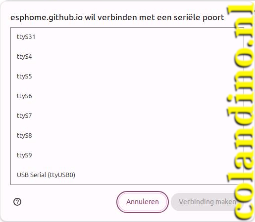 - Selecteer de door de ESP32 gebruikte seriéle poort, in ons geval USB Serial (ttyUSB0)