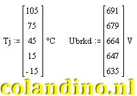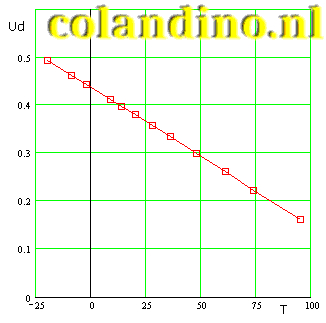 In figuur 6 is de doorlaatspanning afhankelijkheid van de temperatuur te zien van een BYV29 diode. De vierkantjes in de grafiek zijn de meetpunten. Te zien is dat er een lineair verband bestaat tussen temperatuur en doorlaatspanning. Dit verband is in een vergelijking uit te drukken. Voor het opstellen van de vergelijking worden twee ver uit elkaar gelegen meetpunten gebruikt die mooi op de lijn liggen: