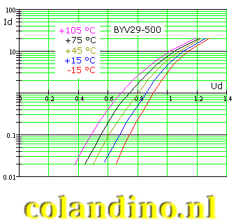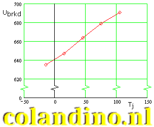 In figuur 16 en 17 zijn de meetresultaten weergegeven in een tabel en grafiek. Van de geteste BYV29-500 wordt een maximum “reverse voltage” opgegeven van 500 V. De breakdownspanning van het geteste exemplaar blijkt een stuk hoger te liggen.