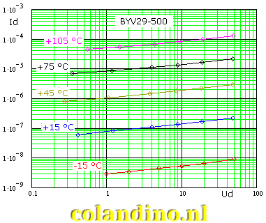 De bewuste diode waaraan in dit voorbeeld gemeten is kan een sperspanning tot 500 V verdragen. Er is slechts tot 60 V gemeten omdat geen hogere stabiele voedingsspanning aanwezig was. In principe moet gemeten worden tot aan de spanning waarbij de diode gebruikt wordt om zinvolle data te verkrijgen.