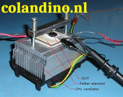 In figuur 5 is de meetopstelling te zien aan een diode in TO220 behuizing. De diode is op een peltier-element geklemd. De warmte van het element wordt met een CPU-ventilator afgevoerd. Op deze manier kan de diode in een temperatuurbereik van -20 °C tot +100 °C worden gemeten.
