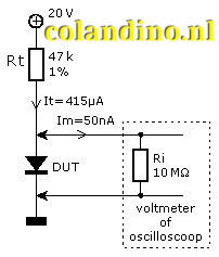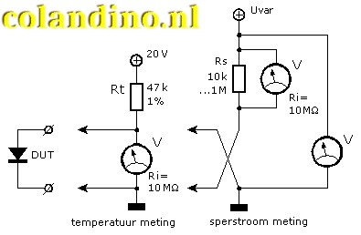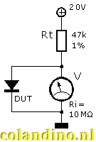 Hiernaast staat het schema afgebeeld waarmee de junctietemperatuur gemeten kan worden. Door de diode wordt een constante stroom gestuurd van 415 µA. Deze stroom wordt bepaald door de spanning van 20 V min de diodespanning en de weerstand Rt. De stroom is enigszins afhankelijk van de variatie in de diodespanning. Eventueel kan de spanning en weerstand verhoogt worden om een grotere nauwkeurigheid te bereiken.