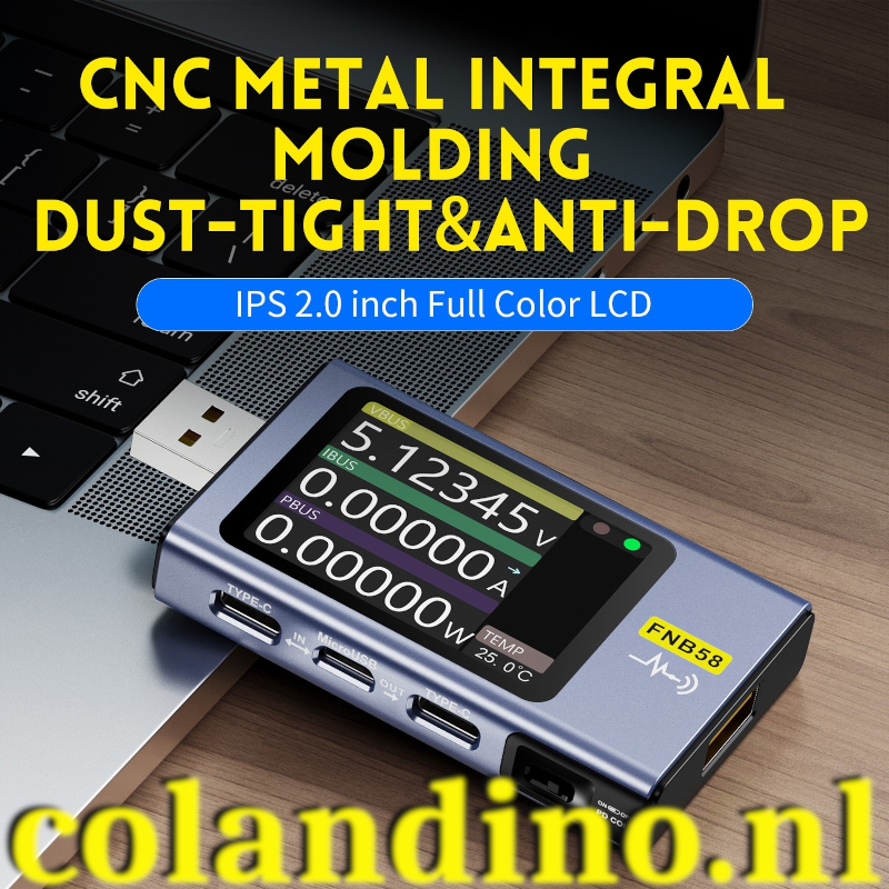 De Fnirsi FNB58 USB-tester met Bluetooth kan de real-time spanning en stroom meten voor USB-A, USB-C en Micro USB. Deze USB-tester meet ook de rimpel en de vermogensafgifte.