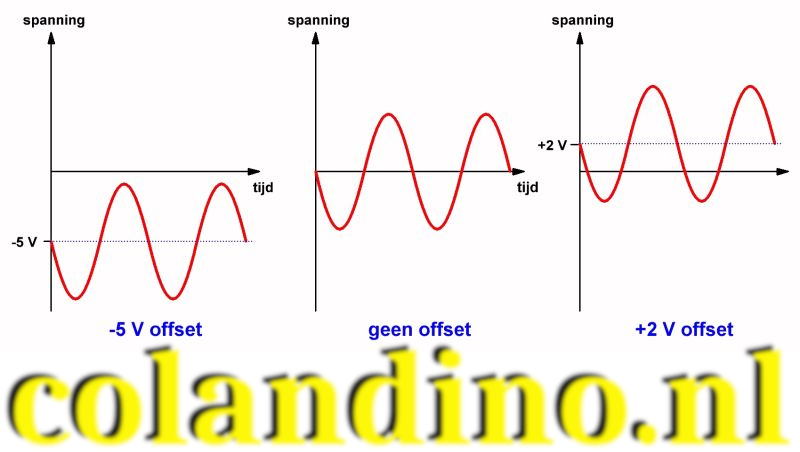 De meeste functiegeneratoren bieden de mogelijkheid het uitgangssignaal te superponeren op een instelbare gelijkspanning. Dit wordt de ‘offset’ genoemd en daarvoor staat een extra potentiometer op de frontplaat ter beschikking. In de onderstaande illustratie is voorgesteld hoe de offset werkt. In de middelste grafiek is de offset uitgeschakeld of ingesteld op 0 V. In de linker grafiek is de offset ingesteld op -5 V, u ziet hoe de sinusspanning nu naar het negatieve deel van de grafiek opschuift en uitsluitend negatief is. In de rechter grafiek is de offset ingesteld op +2 V, de sinus schuift op naar boven en wordt meer positief dan negatief.
