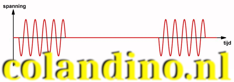 Sommige functiegeneratoren bieden een optie die ’tone-burst’ wordt genoemd. Hiermee kunt u het uitgangssignaal op commando van een extern signaal in- en uitschakelen. Hierbij zorgt de interne elektronica ervoor dat het schakelen altijd gebeurt nadat een volledige periode van het uitgangssignaal is gegenereerd. In de onderstaande figuur ziet u bijvoorbeeld zo’n tone-burst die bestaat uit vijf volledige perioden van een sinussignaal. Nadien zal de generator gedurende tien perioden geen signaal genereren.