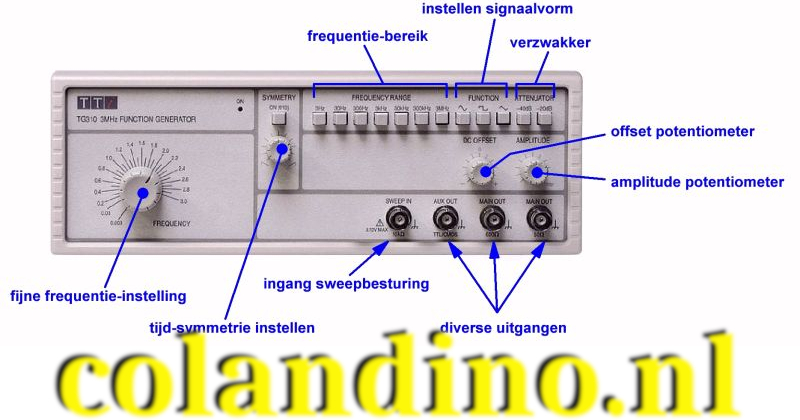 In de onderstaande foto is het typisch uiterlijk van een analoge functiegenerator voorgesteld, de TG310 van AIM-TTI INSTRUMENTS. In deze figuur zijn de diverse reeds besproken functies aangegeven.