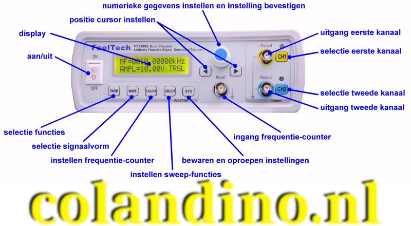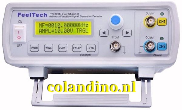 In de onderstaande foto wordt een typische vertegenwoordiger van deze moderne apparaten voorgesteld, de Chinese FY3200S. Het eerste dat opvalt is dat er maar één draaiknop op het apparaat aanwezig is, maar wel een heleboel drukknopjes. Met deze drukknopjes selecteert u één functie van het apparaat en door aan de draaiknop te draaien kunt u de specificaties van de geselecteerde functie instellen. Deze handelingen worden natuurlijk begeleid door teksten in het display. Achter deze ene draaiknop gaat overigens geen draaipotentiometer schuil, maar een zogenaamde encoder die pulsjes levert als u er aan draait. De in de functiegenerator aanwezige microprocessor detecteert de volgorde van deze pulsjes en interpreteert wat u aan het doen bent.