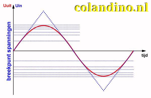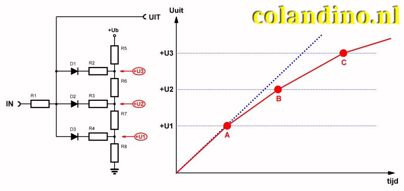 Duidelijk blijkt dat in het gebied A/B de ingangsspanning steeds kleiner is dan de uitgangsspanning. Als de driehoek op de ingang groter wordt dan +U2 gaat ook de diode D2 geleiden. Er vloeit nu een tweede stroom af naar de massa en wel via R1, D2, R3, R7 en R8. Er vloeien nu twee stromen door R1, met als gevolg dat er meer spanning tussen de ingang en de uitgang verloren gaat. Het verschil tussen de uitgangsspanning en de ingangsspanning wordt nog groter, zie het stukje grafiek B/C. Als de ingangsspanning groter wordt dan +U3 gaat ook de diode D1 geleiden. Er vloeit nu een derde stroom door R1, die via de diode D1 en de weerstanden R2, R6, R7 en R8 afvloeit naar de massa. Het spanningsverschil tussen in- en uitgang wordt nog groter.
