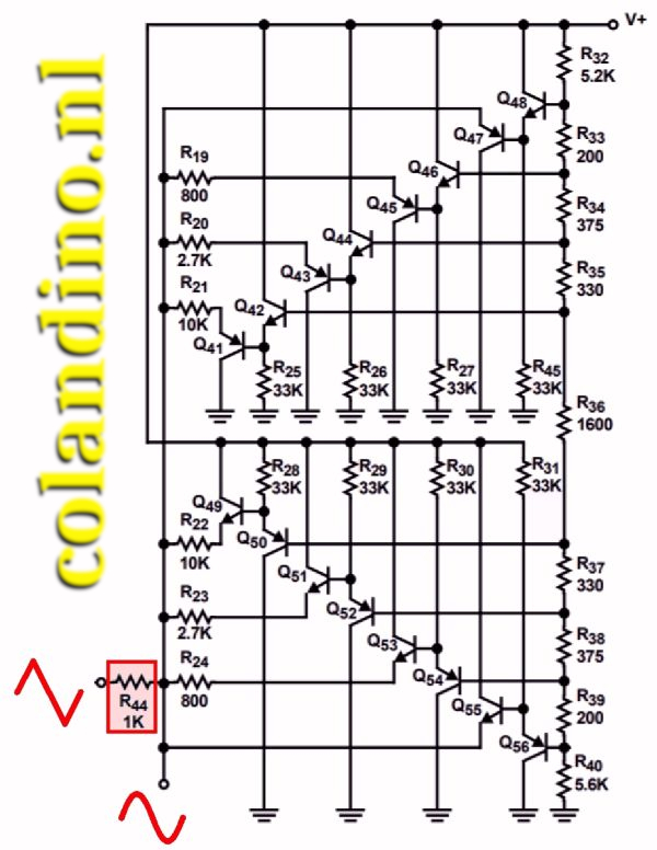 Dat in de praktijk nogal ingewikkelde schakelingen worden gebruikt toont de onderstaande figuur. Deze toont het schema van de driehoek naar sinus omzetter in de ICL8038 functiegenerator chip. Hier worden de dioden van het principeschema vervangen door een heleboel transistoren die op een bepaald moment in het verloop van de driehoekspanning in geleiding worden gestuurd en de belasting van de driehoek laten toenemen. Hierdoor stijgt de stroom door weerstand R44. Er valt dus steeds meer spanning over deze weerstand en wordt hetzelfde ‘afplattingseffect’ verkregen als met de dioden.