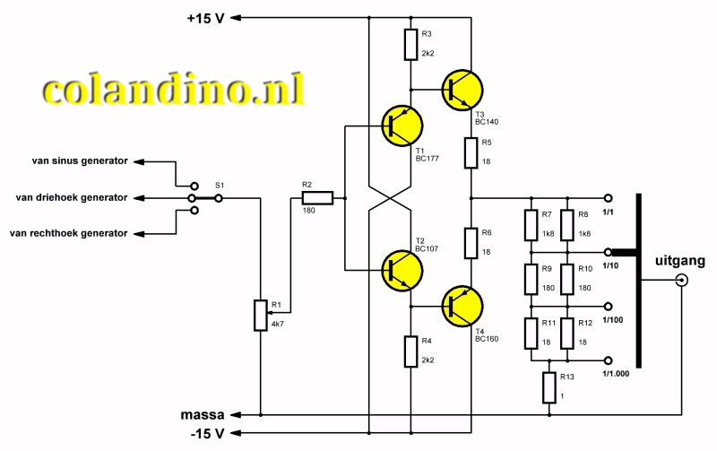 Onderstaande figuur geeft een eenvoudig schemaatje van een universele eindtrap, die zich letterlijk duizendvoudig in de praktijk heeft bewezen. Het is een complementair ontwerp, dat in een heleboel analoge functiegeneratoren in de een of andere vorm wordt toegepast. Dank zij deze speciale complementaire structuur is de bandbreedte zeer hoog, zodat blokspanningen van 200 kHz zonder merkbare vervorming uit de trap komen. Nadeel is dat de spanningsversterking gelijk is aan een, er wordt dus geen spanning versterkt, wel uiteraard stroom. De uitgangsstroom bedraagt maximaal ±50 mA. De trap wordt afgesloten met een resistieve 1/10/100/1.000 spanningsdeler, zodat de uitgangsspanning van de functiegenerator tot op de millivolt nauwkeurig kan worden ingesteld.