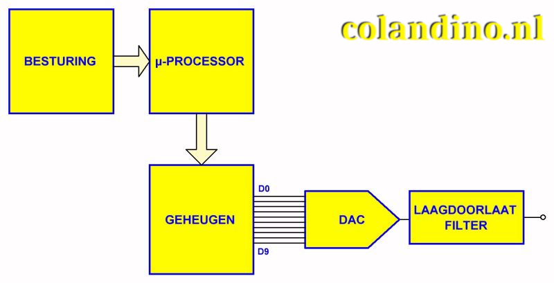 Als u de generator instelt op een bepaalde golfvorm en een bepaalde frequentie zorgt de software ervoor dat de digitale signaalvorm samples die in het geheugen zijn opgeslagen door de microcontroller in de juiste volgorde en met de juiste snelheid op de datalijnen worden gezet. Via een DAC (digitaal naar analoog converter) worden deze digitale samples omgezet in analoge spanningen die een trapvormige benadering van het gewenste uitgangssignaal samenstellen. Na de DAC volgt meestal nog een laagdoorlaat filter met als taak de trapjes van de ’trapvormige benadering’ zo goed mogelijk af te vlakken.