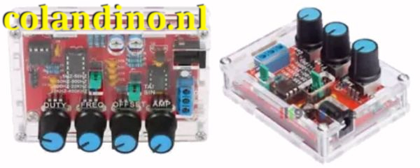 Voor wie niet erg hoge eisen stelt en alleen met laagfrequent schakelingen werkt bestaan er twee Chinese bouwpakketjes van analoge functiegeneratoren die voor minder dan tien euro worden aangeboden. Deze maken gebruik van twee oeroude IC’s, de XR2206 en de ICL8038, die nu door Chinese fabrikanten als second source nog steeds worden gebakken. In de onderstaande foto ziet u hoe die apparaatjes er uit zien. Er is uiteraard op alles bezuinigd dat meer dan één euro kost. U moet de apparaatjes voeden uit een netstekkervoeding. Bereikenomschakelaars zijn vervangen door jumpertjes op de print. BNC-connectoren zijn uiteraard uit den boze bij dergelijke goedkope apparaatjes. De uitgangssignalen worden aangeboden op printkroonsteentjes.