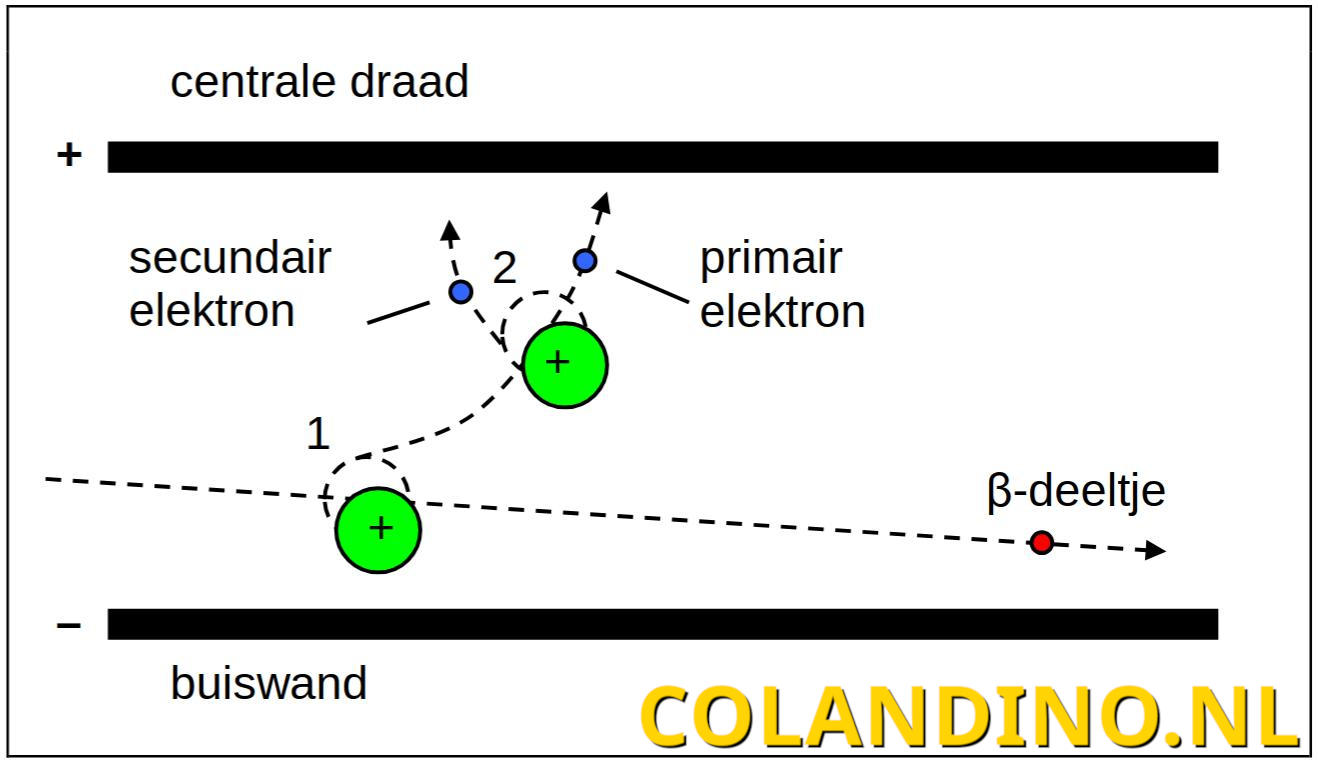 Als een energierijk geladen deeltje of foton in de buis binnendringt, zal het een klein aantal atomen van het gasmengsel ioniseren. Er ontstaan dus enkele positief geladen gas-ionen en negatief geladen elektronen in de buis. De positief geladen gas-ionen worden aangetrokken door de negatief geladen buiswand, en bewegen onder invloed van deze elektrische kracht naar de buiswand. De negatief geladen elektronen worden aangetrokken door, en bewegen dus naar de positief geladen centrale draad. Dit is weergegeven in figuur 2: een β-deeltje (rood) ioniseert een gas-atoom (1), waardoor een gas-ion (groen) en een elektron (blauw) ontstaan. Dit elektron noemen we een primair elektron. De beweging van het primair elektron naar de centrale draad onder invloed van de elektrische kracht is versneld. Tijdens de beweging neemt dus de snelheid, en daarmee de kinetische energie van het primair elektron toe. Deze toename van de kinetische energie hangt af van de spanning over de buis: hoe groter de spanning is, des te groter is de toename van de kinetische energie. Als de spanning over de buis groot genoeg is, kan een primair elektron onderweg naar de centrale draad dan op zijn beurt gasatomen ioniseren. Ook dit is weergegeven in figuur 2: het primair elektron ioniseert een gas-atoom (2), waardoor een gas-ion en een elektron ontstaan. Dit elektron noemen we een secundair elektron. Er ontstaat zo een lawine-effect (of sneeuwbaleffect): één binnendringend energierijk deeltje maakt een aantal primaire elektronen vrij, die op hun beurt elk weer een aantal secundaire elektronen vrijmaken. Zo ontstaat een stroom van miljoenen elektronen naar de centrale draad toe. Nadat deze elektronen op de centrale draad zijn aangekomen, bewegen ze verder via een weerstand en de spanningsbron naar de buiswand. Daar recombineren de elektronen en de gas-ionen, zodat het gasmengsel weer volledig uit atomen bestaat. Dit alles gebeurt in een zeer korte tijd: zo’n 10–4 s.