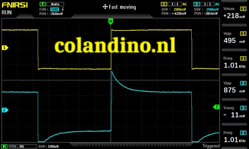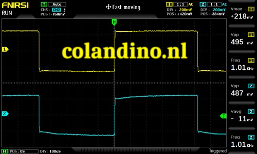 De FNIRSI 1014D oscilloscoop werkt op verschillende manieren anders dan mijn oudere oscilloscopen. Om te beginnen is hij veel minder gevoelig dan mijn Tektronix 2211 of B&K 1472. Voor elke meting waarbij de belasting van het te meten circuit belangrijk is, dat wil zeggen elk circuit met een impedantie van ruim boven de 1000 ohm of een frequentie van ruim boven de 100 kHz, moet je X10-probes gebruiken om een voldoende klein belastingseffect te hebben om het circuit niet te verstoren. Dat betekent dat je meestal X10-probes moet gebruiken. Met de maximale gevoeligheid van 50 mV/div en de 10x-probe van de FNIRSO produceert een 500 mV-signaal slechts één deling op het scherm en is er bij die gevoeligheid sprake van ruis.