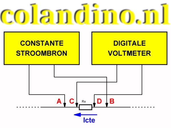 Hoe groot deze weerstand ̶ binnen bepaalde grenzen ̶ ook is, de stroom die er doorheen vloeit is altijd hetzelfde. Deze stroom wordt aan- en afgevoerd via de meetpennen A en B. Met twee andere meetpennen C en D wordt de spanning gemeten die over de onbekende weerstand ontstaat. Uit de wet van ohm kan de elektronica dan op een heel eenvoudige manier de waarde van de weerstand afleiden.