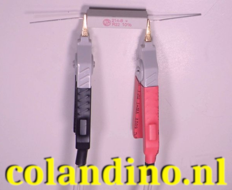 In de praktijk worden de meetpennen A en C en B en D meestal gecombineerd in zogenaamde kelvin-meetprobes. In de onderstaande foto ziet u hoe die er uitzien. Met de tangen met vergulde bekken maakt u een goed contact met de te meten lage weerstand. Uit iedere tang komen twee meetsnoertjes. Met het ene wordt de constante stroom aan- of afgevoerd, met de tweede wordt de te meten spanning aan de multimeter aangeboden.