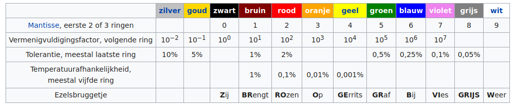 Soms is er nog een zesde ring die aangeeft hoe de waarde van de component beïnvloed wordt door de temperatuur.