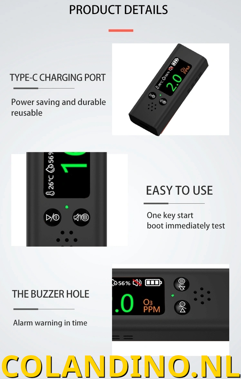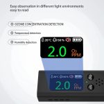 Dit product wordt voornamelijk gebruikt om de omgevingstemperatuur, vochtigheid en ozonconcentratie te detecteren.Wanneer de ozonconcentratie hoger is dan 5,0 ppm, klinkt er een piepend alarmgeluid om gebruikers te waarschuwen voor omgevingsveranderingen.