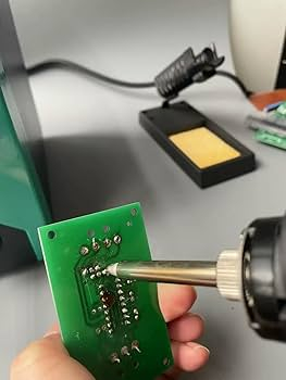 Het eerste dat opvalt na het inschakelen, is de nogal rumoerige ventilator die achterin de behuizing zit. Dit is niet iets dat je de hele tijd wilt horen boven je werktafel, maar je zet het station hoogstwaarschijnlijk alleen maar aan als je het echt gaat gebruiken. Dan gaan we maar eens wat desolderen op een oud printje. Omdat de soldeereilandjes die ik wil desolderen niet zo groot zijn, begin ik met een temperatuur van 350 graden en dat blijkt best goed te gaan. De eerste keren is het wel even wennen als na het indrukken van de knop op het desoldeerpistool het vacuümpompje in het station begint de draaien, want dat maakt een soort ratelend geluid dat boven de ventilator uit komt. Maar goed, afgezien daarvan werkt het desolderen voortreffelijk.