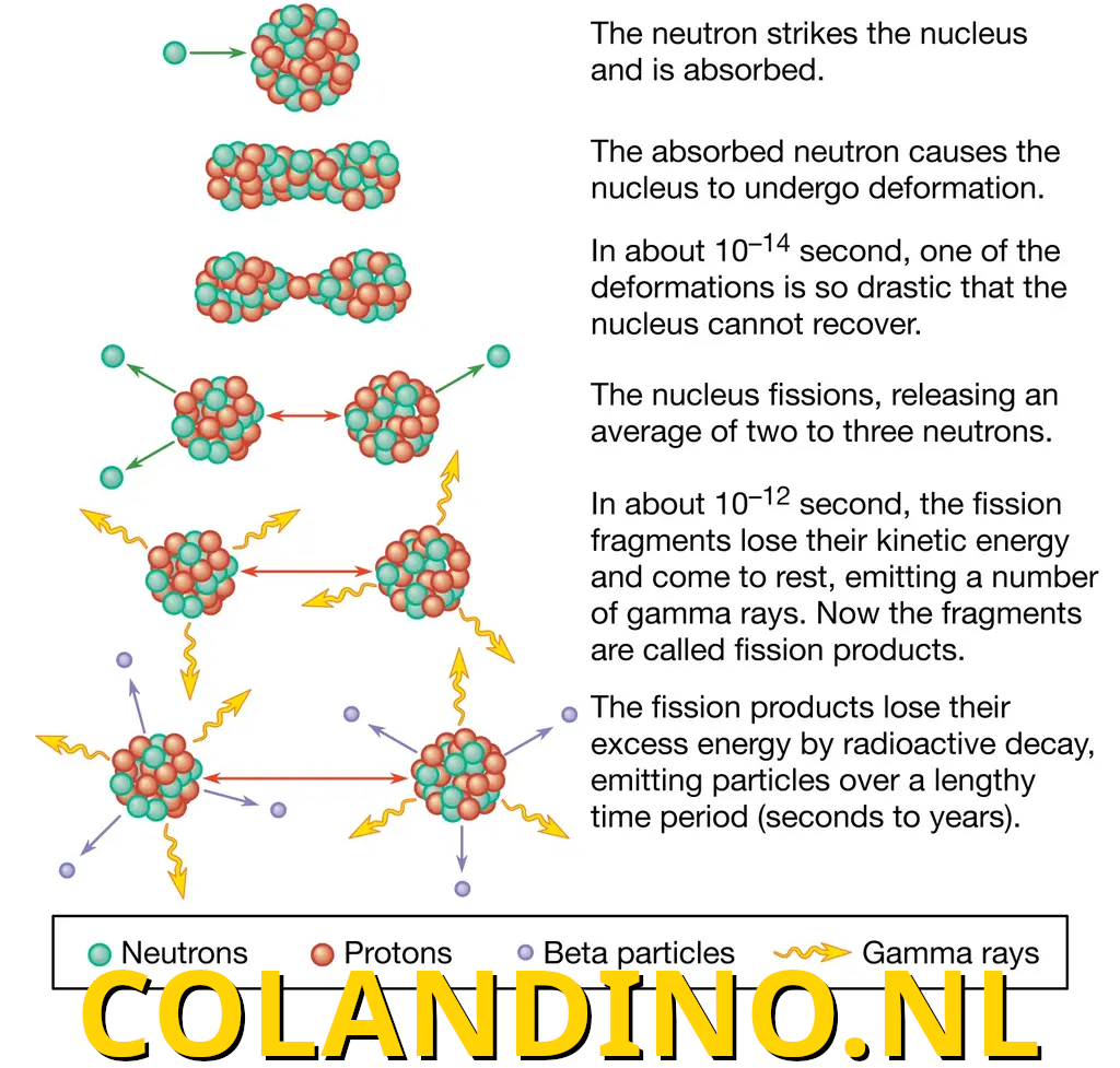 Wanneer een vrij (of niet-gebonden) neutron de kern van een splijtbaar atoom binnendringt, kan dit de kern in twee kleinere delen splitsen. Dit is het splijtingsproces, dat gepaard gaat met de vrijgave van een grote hoeveelheid energie. De kleinere (of lichtere) kernen die ontstaan, worden “splijtingsproducten” genoemd. De volledige splijting van 1 pond uranium of plutonium levert evenveel explosieve energie op als de explosie van ongeveer 8000 ton TNT.