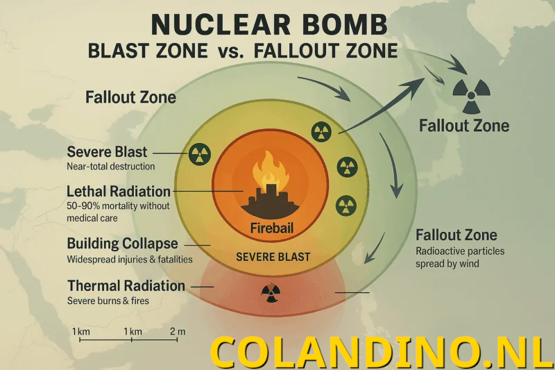 Ten vierde gaat een kernexplosie gepaard met zeer doordringende en schadelijke onzichtbare straling, de zogenaamde “initiële kernstraling”.