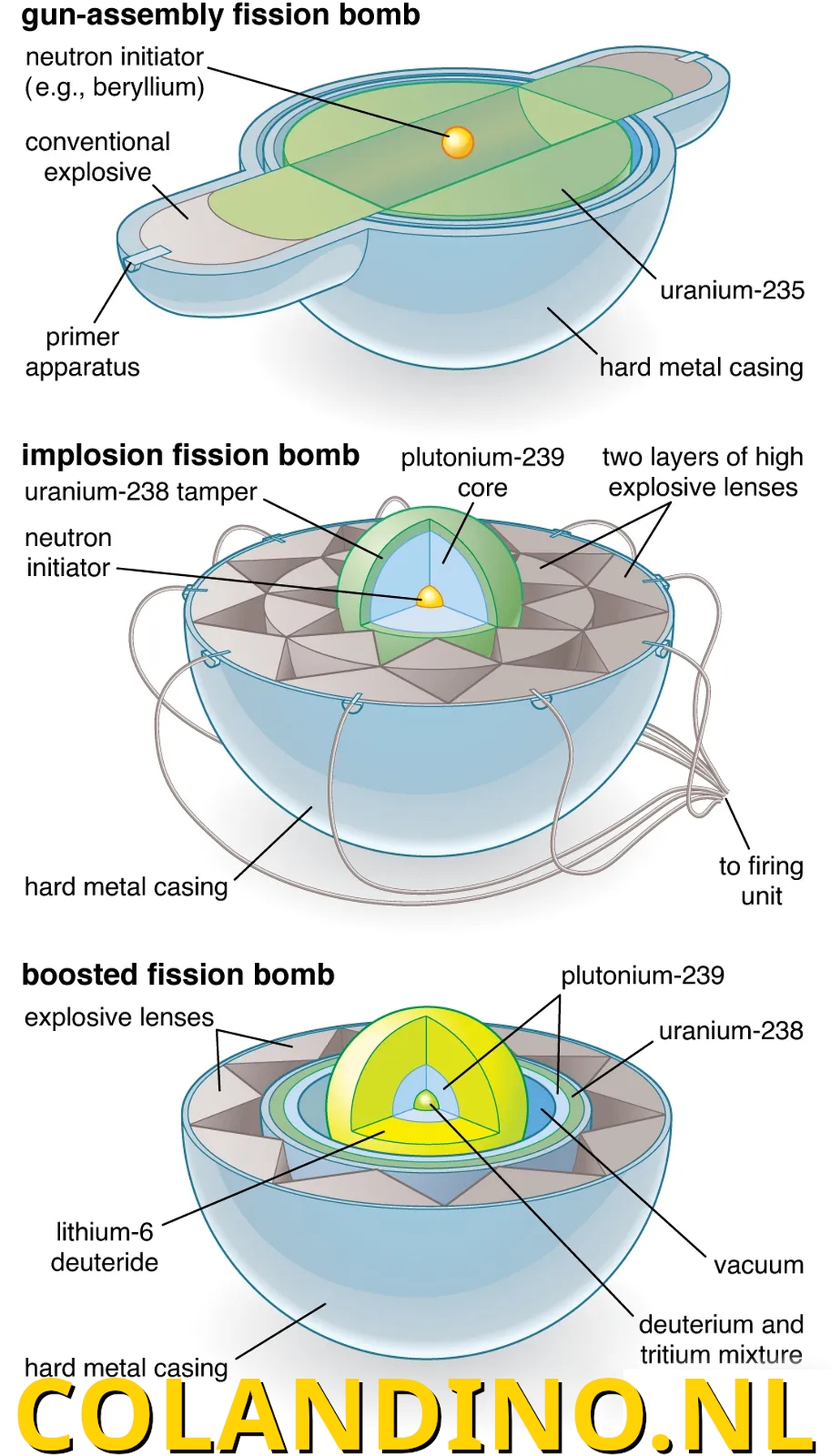 De minst voorkomende van deze isotopen, uranium-235, is de gemakkelijk splijtbare variant die gewoonlijk in kernwapens wordt gebruikt. Een andere isotoop, uranium-233, komt niet in de natuur voor, maar is ook gemakkelijk splijtbaar en kan kunstmatig worden gemaakt uit thorium-232. Omdat er slechts onbeduidende hoeveelheden van het element plutonium in de natuur voorkomen, wordt de splijtbare isotoop die in kernwapens wordt gebruikt, plutonium-239, kunstmatig gemaakt uit uranium-238.
