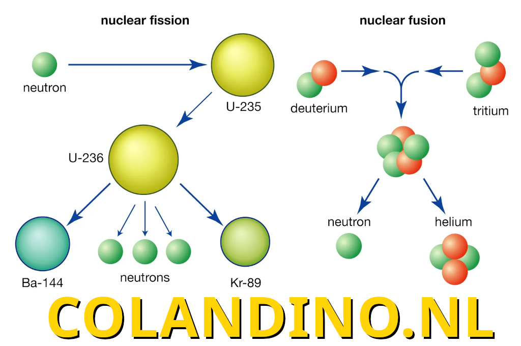 Rechts: Deuterium en tritium combineren door kernfusie tot helium plus een neutron.
