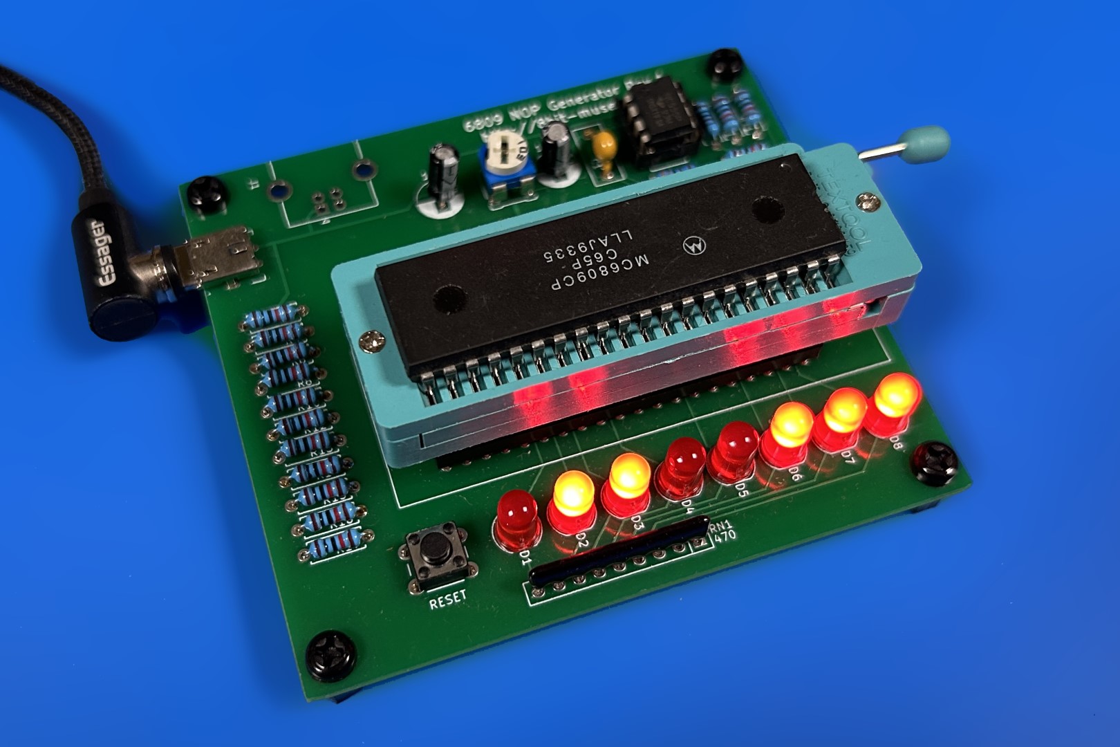 In een NOP-tester voert een CPU alleen NOP-commando’s (No Operation) uit. Acht LED’s worden gebruikt om de onderste adreslijnen te bewaken. Als de CPU de NOP’s uitvoert, zouden de adressen continu moeten worden verhoogd.