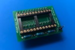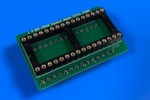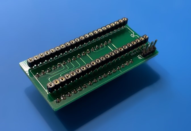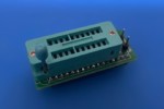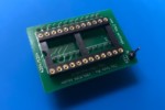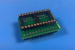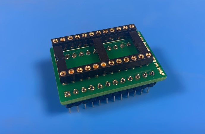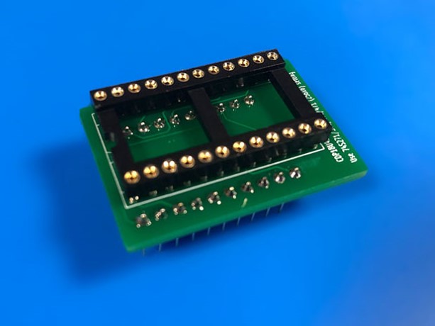 Deze 28-pins adapter maakt eenvoudig contact mogelijk met zowel de chip als de uitgang van de tester. Jumpers kunnen worden gebruikt om de directe verbinding tussen de tester en de te testen IC te onderbreken.