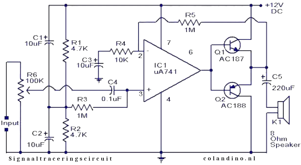 De IC1 uA 741 is bedraad als een niet-inverterende versterker met hoge versterking en de uitgang wordt versterkt door een paar complementaire transistoren (Q1 en Q2) om de luidspreker aan te sturen.
