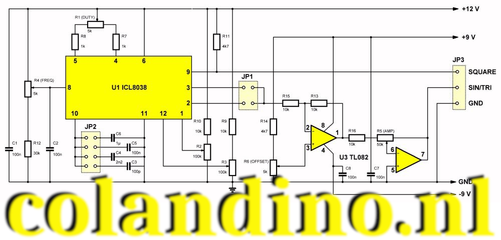 Gelukkig is het niet moeilijk om het sporenpatroon op het printje te volgen en om te zetten in een schema. Het resultaat ziet u in de onderstaande figuur. Het eerste dat opvalt is dat de ontwerpers op diverse plaatsen afwijken van het door de fabrikant van de ICL8038 voorgeschreven schema. Het frequentiebereik wordt geselecteerd door het naar de massa schakelen van een van de condensatoren C3-C4-C5-C6 via de jumper JP2. De frequentie in de gekozen band wordt ingesteld met de potentiometer R4 (FREQ). Met de potentiometer R1 (DUTY) kunt u de tijd-symmetrie van het uitgangssignaal instellen. Het netwerk R2-R10-R3-R9 wordt gebruikt voor het minimaliseren van de vervorming op de sinus. Op pen 9 staat de blokgolf ter beschikking. Dat is een open-collector uitgang die extern wordt belast met de weerstand R11 en rechtstreeks naar de uitgang JP3 gaat. De driehoek op pen 3 en de sinus op pen 2 gaan naar de jumper JP1, waarmee u de gewenste signaalvorm kunt instellen. De schakeling rond de ICL8038 wordt rechtstreeks gevoed uit de voedingsspanning die u aan het printje aansluit, dus met +12 V.