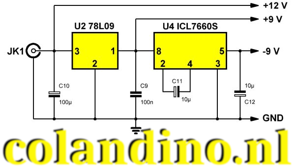 In de onderstaande figuur is de voeding getekend die de ontwerpers bedacht hebben. De 12 V van de netstekkervoeding wordt ontkoppeld met C10 en voedt rechtstreeks de ICL8038. Uit deze spanning wordt door middel van een 78L09 een positieve spanning van 9 V afgeleid. Met een ICL7660S omzetter wordt uit deze spanning de negatieve voedingsspanning van -9 V gegenereerd. Dat werkt uitstekend. Bij onze schakeling waren de spanningen uit deze schakeling zo goed als symmetrisch: +8,96 V en -8,65 V.