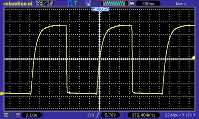 Bij dit oscillogram moeten wij opmerken dat wij met een gecompenseerde 1/10 probe hebben gemeten, zodat de uitgang minimaal capacitief wordt belast. Als u de blokgolf rechtstreeks meet, dan is de stijgtijd een stuk slechter.