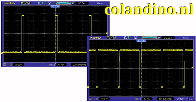 Dat is dus niet zo best! Bij een regeling volgens het boekje zou de frequentie van het signaal constant blijven en zou alleen de tijdsymmetrie variëren. LET OP! De twee oscillogrammen hebben niet dezelfde tijdbasis instelling. Links 80 μs/div, rechts 20 μs/div.