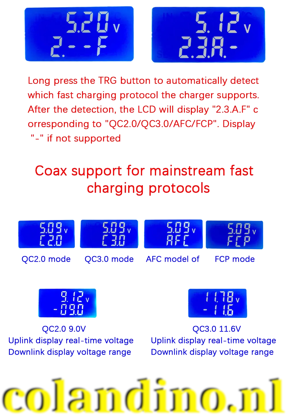- Snellaadtriggermodus: QC2.0 5V/9V/12V/20V, QC3.0, AFC9V, FCP