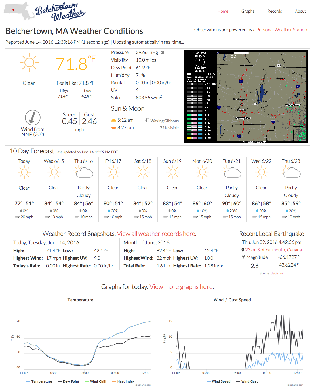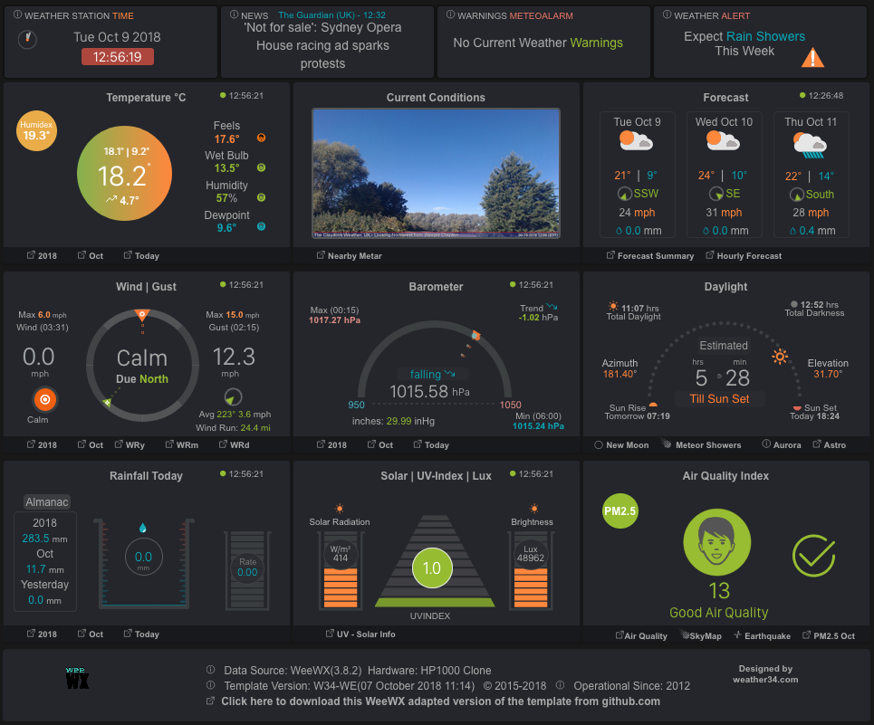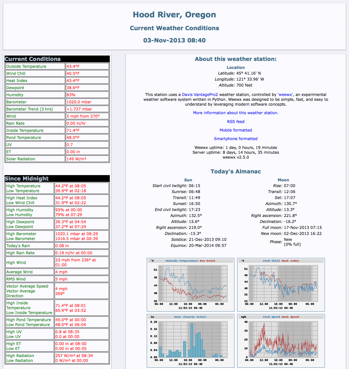 WeeWX runs under most versions of Linux, as well as macOS, *BSD, and Solaris. Many users are running on the Raspberry Pi. The images on this page and throughout this web site are from sample stations running WeeWX.