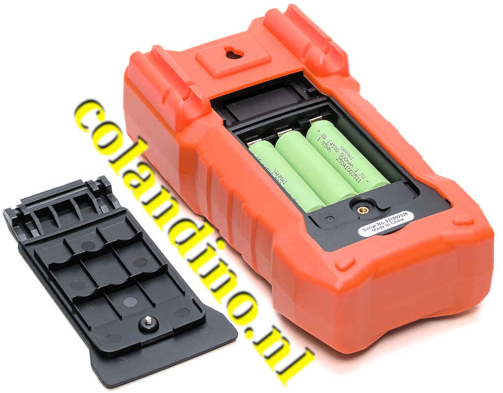 Het batterijcompartiment achter de klapvoet is met een enkele schroef vastgezet. Er worden drie Li-Ion-batterijen van maat 14500 gebruikt, die in serie zijn aangesloten. Aangezien de ZT-1000R geen geïntegreerde oplaadfunctie heeft, moeten de batterijen worden verwijderd voor opladen en opgeladen in een externe oplader.
